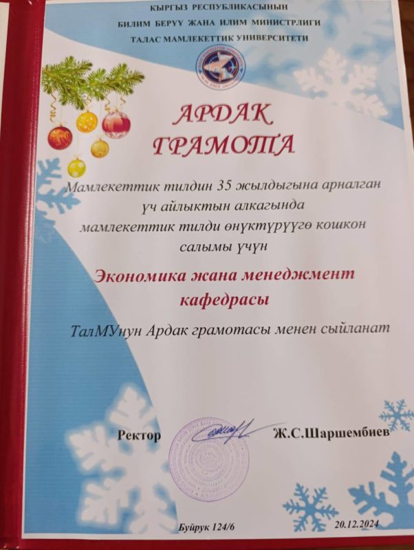 Бүгүн 2025-жылдын 17-апрелинде КР Улуттук илимдер академиясында Кыргызпатент уюштурган “Кыргыз Республикасында ойлоп табуучулук жана инновациялык ишмердүүлүктү активдештирүү жана стимулдаштыруу” аталышында эл аралык конференцияга катыштым. ТалМУнун доценти, техн.и.к. Абдрахманов И.А., ТалМУнун окуу жана илимий иштери боюнча проректору, техн.и.к., доцент Сурапов А.К. менен биргеликте “Алтыгана бадалын жок кылуу ыкмалары маселесине карата” аттуу илимий макалабыз жарык көрдү жана илимий баяндама жасадык.