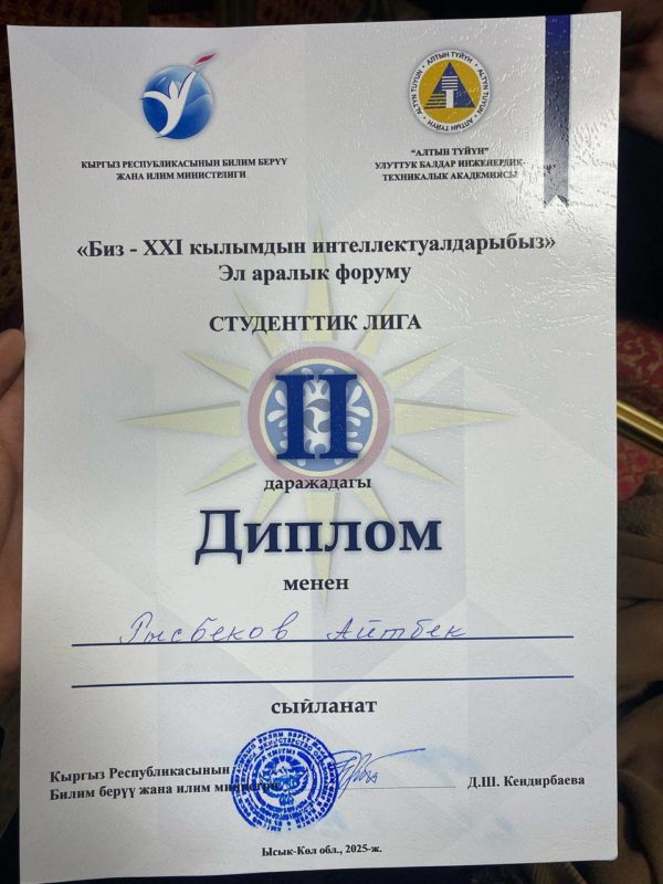 Талас мамлекеттик университетинин жетекчилиги, жамааты жана студенттери бул ийгиликти терең сыймык менен кабыл алып, Рысбеков Айтбекти жана анын жетекчиси Абдрахманов Иманбек Асановичти чын дилинен куттуктап, ыраазычылык билдирет!
