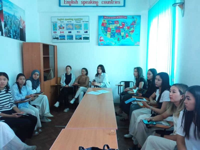 5 июня заведующая кафедрой мировых языков, к.п.н., доцент Уркумбаева Р.А., и доцент кафедры истории и правоведения, к.и.н., Усубалиева А.С., провели профориентационную встречу с выпускниками профилей «Иностранный язык» и «Правоведение» Гуманитарно-юридического колледжа.