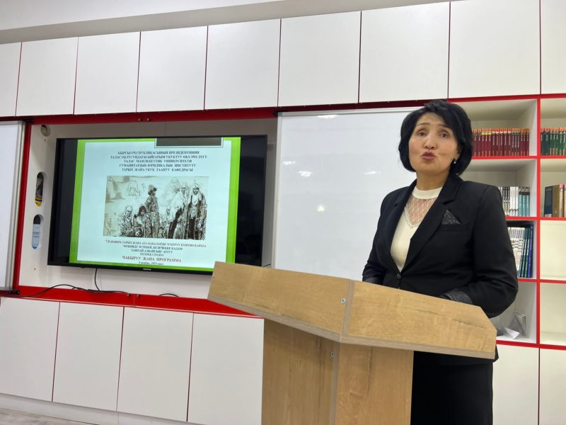 “Өткөндү эстебей,келечекке кадам таштай албайсың” аттуу темада КРнын Президентинин Талас облусундагы ыйгарым укуктуу өкүлчүлүгү менен Талас мамлекеттик университетинин гуманитардык-юридикалык институтунун, тарых жана укук кафедрасы менен бирдикте иш-чара болуп өттү. Алгач Талас мамлекеттик университетинин мамлекеттик тил, инфраструктураны өнүктүрүү жана эл аралык байланыштар боюнча проректору К.Т.Жунусалиева ачып, иш-чаранын өтүшүнө ийгилик каалады.Андан соң Кыргыз Республикасынын Президентинин Талас облусундагы ыйгарым укуктуу өкүлүнүн орун басары М.Э. Сейдикеримова куттуктап, бүгүнкү күндүн тарыхына токтолуу менен тарыхыбызды муундан муунга сактап, жеткирүү биздин милдетибиз деп баса белгиледи.Видео куттуктоолор берилип, чакырылган коноктор куттукташып, эскеришип, сунуштарын айтышты. Иш-чаранын катышуучулары К.Кеңешбеков атындагы тарыхый музейи менен таанышып, кол өнөрчүлөр тарабынан уюшулган улуттук кийимдерди чагылдырган “Марал” сулуулук этно үйүнүн уюштурган көргөзмөсү (заманбап улуттук кийимдердин парады)менен таанышышты.“”Тарыхы болбой эл болбойт, тамыры болбой дарак болбойт” демекчи , тарыхызды сактап, урпактарга жеткирели. Уюштуруучуларга ыраазычылык билдиребиз!