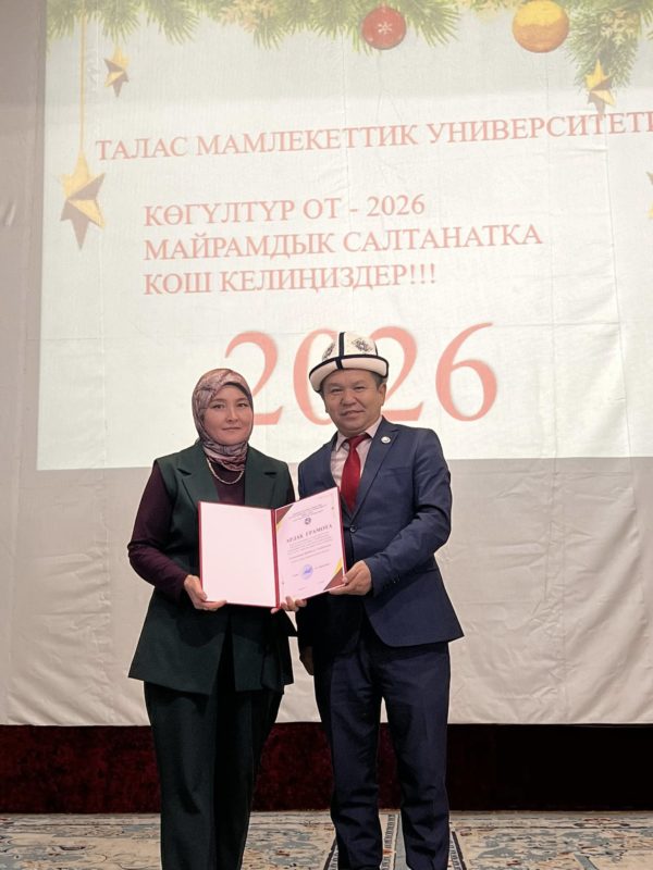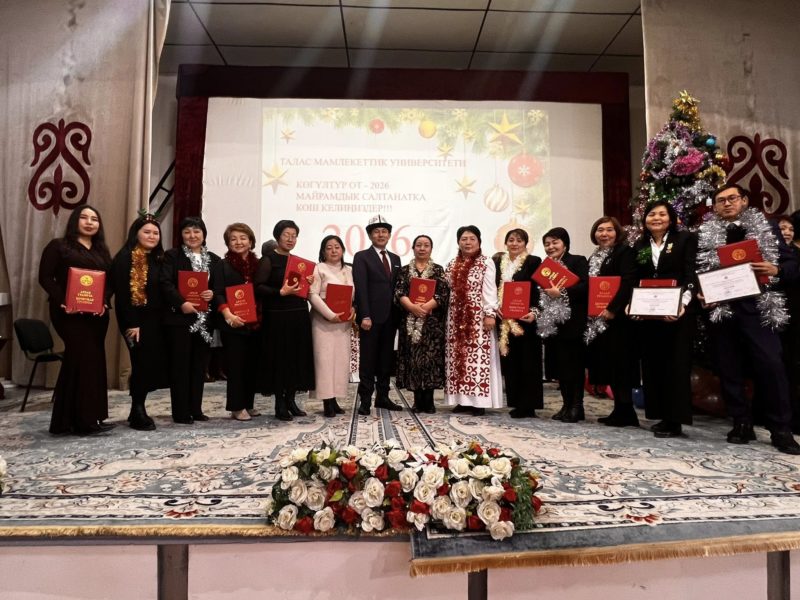 Алгач ТалМУнун ректору Ж. С.Шаршембиев, проректорлор: А.К.Сурапов, К.Т.Жунусалиева, Кесиптик кошундун төрагасы Э.Абдырайымов жалпы кесиптештерди кирип келген жаңы жыл майрамы менен куттукташып, жаңы жылыбыз жакшылытарды алып келген жыл болсун деген каалоолорун билдиришти.Андан соң ТалМУнун өнүгүшүнө ар тараптан колдоо көрсөтүшкөн КР Талас обусунун ыйгарым укуктуу өкүлүнүн орун басары М.Э. Сейдикеримовага, ыйгарым укуктуу өкүлчүлүктүн социалдык иштер бөлүмүнүн башчысы Б.Т.Тагайматовага, Талас шаардык мэриясынын социалдык секторунун башчысы Г.Ш.Орозалиевага жана Талас райондук, шаардык билим берүү бөлүмүнүн башчысы Т.А.Момоконовго ТалМУнун Ардак грамотасы ыйгарылды.